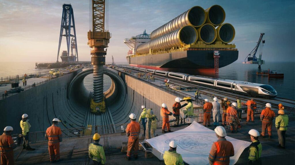 On site nothing about it felt casual. Engineers in bright orange jackets moved around the first shaft in steady patterns. The shaft was a circular opening in the ground that would soon be covered by reinforced concrete. Large tunnel boring machines still wrapped in plastic sat waiting nearby. The support ship operated offshore with cables extending into the water to map the future route where trains will travel underground at 300 km/h.