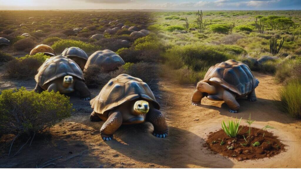 Before giant tortoises were brought back to the islands there was a serious ecological problem. Invasive species such as rats goats and pigs had changed the natural environment & caused native plants and animals to decline. The tortoises now help restore balance to the island habitats by eating shrubs and controlling the spread of invasive plants. This ecological restoration benefits biodiversity in many ways. Since the tortoises returned many plant & animal species that were struggling have begun to thrive. The increase in native plants has led to more native bird species because these birds depend on the plants for food and nesting sites. The tortoises have also helped reduce soil erosion which had become a major problem because of invasive shrubs growing everywhere. When the tortoises eat these plants they clear the landscape and allow native vegetation to grow. This native vegetation is stronger and helps hold the soil in place.