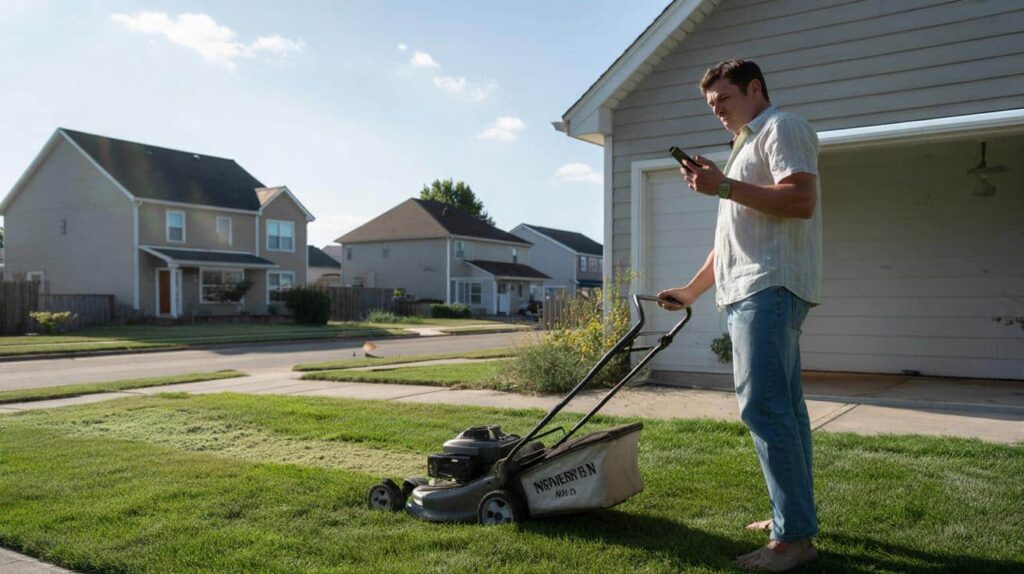 He stared at the mower, then at the notification, feeling oddly…policed in his own backyard.
