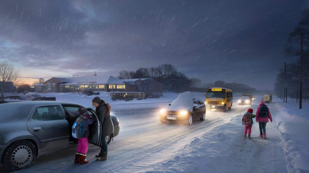 The quiet reality in many homes tonight is simple: plan for school, prepare for chaos. The best move is to set up two parallel mornings in your head. Scenario A: alarm goes off, schools are open, buses running with delays, streets half-plowed. Clothes laid out by the door, boots ready, an extra pair of socks in the backpack. Scenario B: a 6:10 a.m. alert saying buses are suspended, or the school has switched to “parent transport only.” That’s when a quick backup plan matters — a neighbor to carpool with, a relative on standby, remote work already negotiated.
